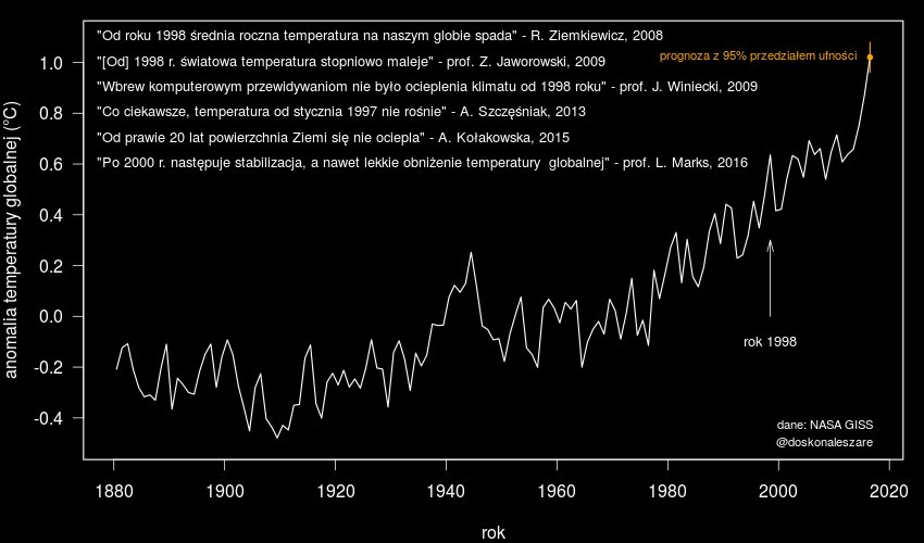 tutaj prezentujesz taki sam poziom, jak ci których nazywasz kłamcami. z tego wykresu wynika, że mniej więcej pomiędzy 1997 a 2012, (może nawet do 2013 czy 2014 – nie ma tam linii siatki, więc dokładnie nie umiem ocenić) anomalia temperatury utrzymywała się na w miarę stałym poziomie ok. 0,6. przyjmując więc za punkt wyjścia lokalne maksimum z 1998, można było stwierdzić w 2008 czy w 2009, że nie było w ostatnich 10 latach ocieplenia lub nawet lekko się oziębiło. to, że dane z ostatnich 2-3 lata tym twierdzeniom już zaprzeczają, to inna sprawa. powiedzenie więc, że się goście zupełnie mylili – OK. ale rzucanie inwektywami i nazywanie tych wypowiedzi z 2008-2009 celowymi kłamstwami czy manipulacjami, to też zwykła manipulacja i demagogia…